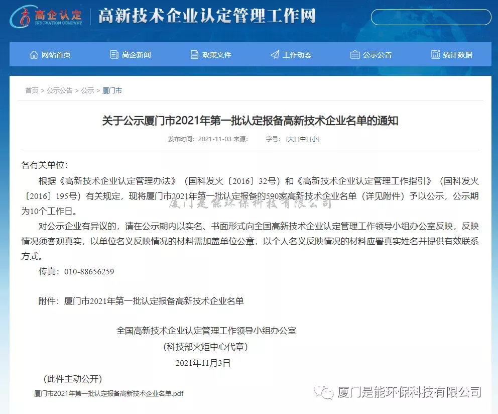 厦门是能环保科技有限公司正式获批成为“厦门市高新技术企业”和“国家高新技术企业”,反映出我公司近年来在自主知识产权、科技成果转化、研发组织能力、销售成长性等各方面的进步和发展,是对公司近年来所做工作的肯定,同时也标志着公司科研创新实力获得了国家的认可。